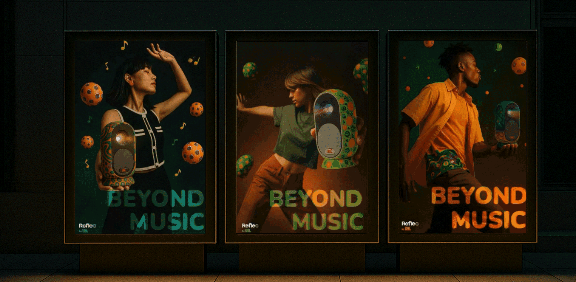 For the branding, I used JBL’s color palette and Yayoi Kusama’s artistic style to create an energetic and experimental feeling. The logo is inspired by projection, reflection, and light — showing how sound transforms space.